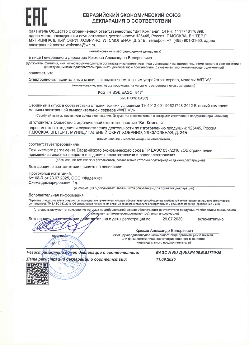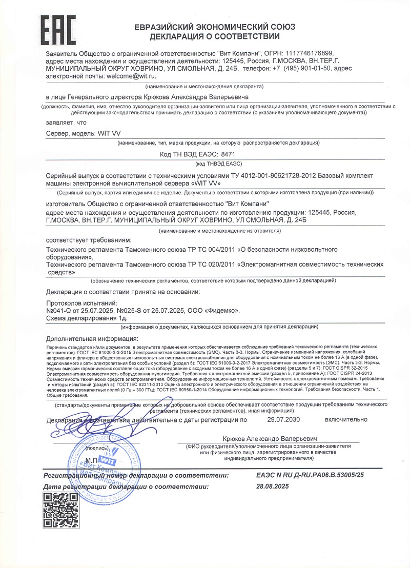 Серверы WIT VV - новые декларации о соответствии 2025 года Таможенного Союза ЕАС